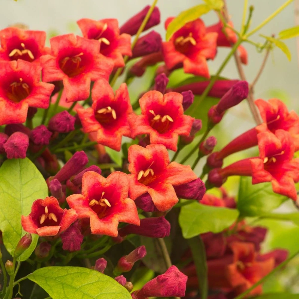 la bignone capreolata atrosanguinea se distingue de l’espèce type par sa fleur pourpre. Cette espèce dispose de fleurs rouges-pourpre à l’extérieur et jaune à l’intérieur dégage un parfum de café ou de chocolat. à la fin de l’été de nombreuses grappes feront leurs apparitions, elles renferment des graines.