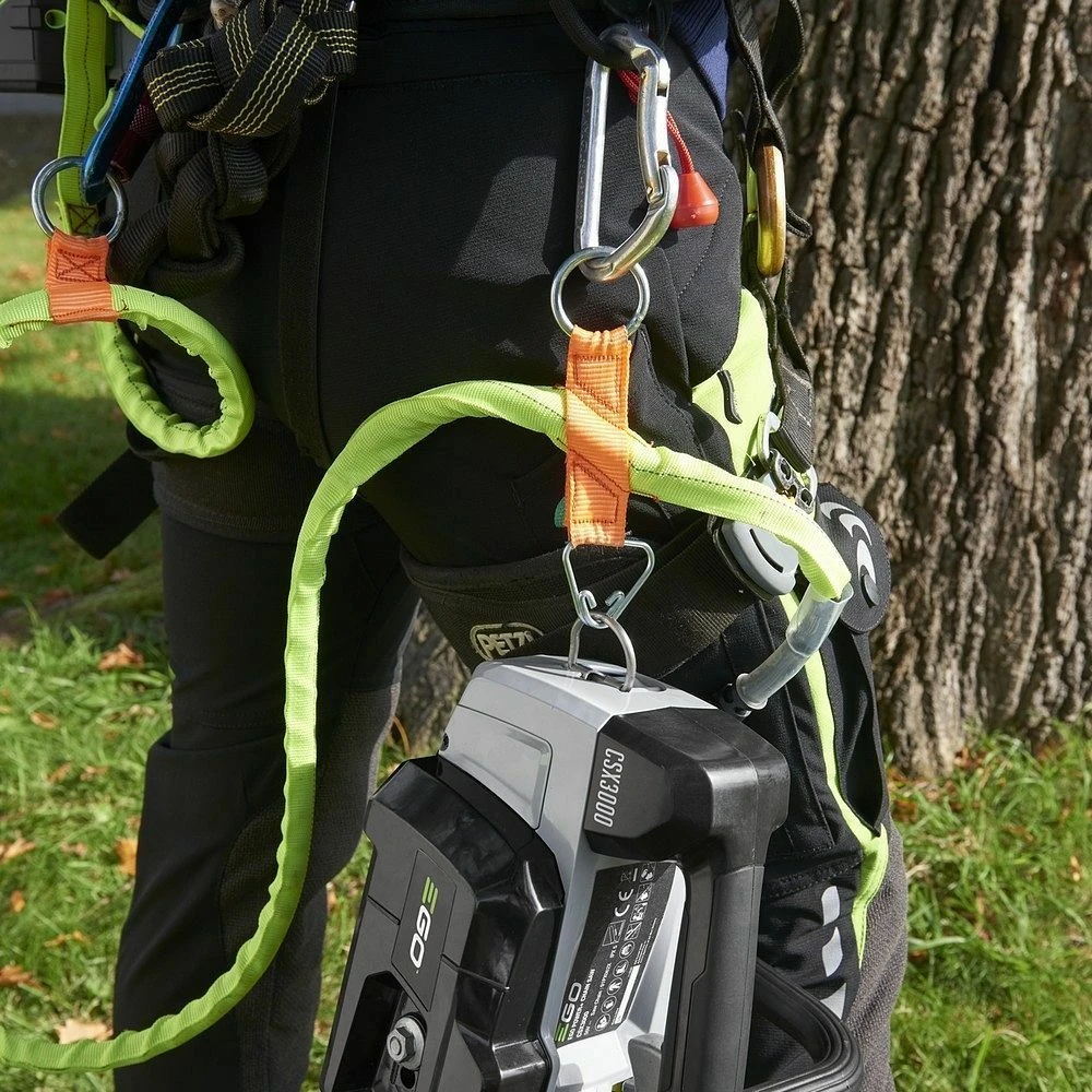 cette tronçonneuse professionnelle compacte est équipée d’une batterie ego 56 volts 4ampères heure, qui sera logée dans l’harnais porte batterie fourni, lui-même fixé à la ceinture de l’utilisateur : le travail est plus confortable avec un poids de machine allégé.